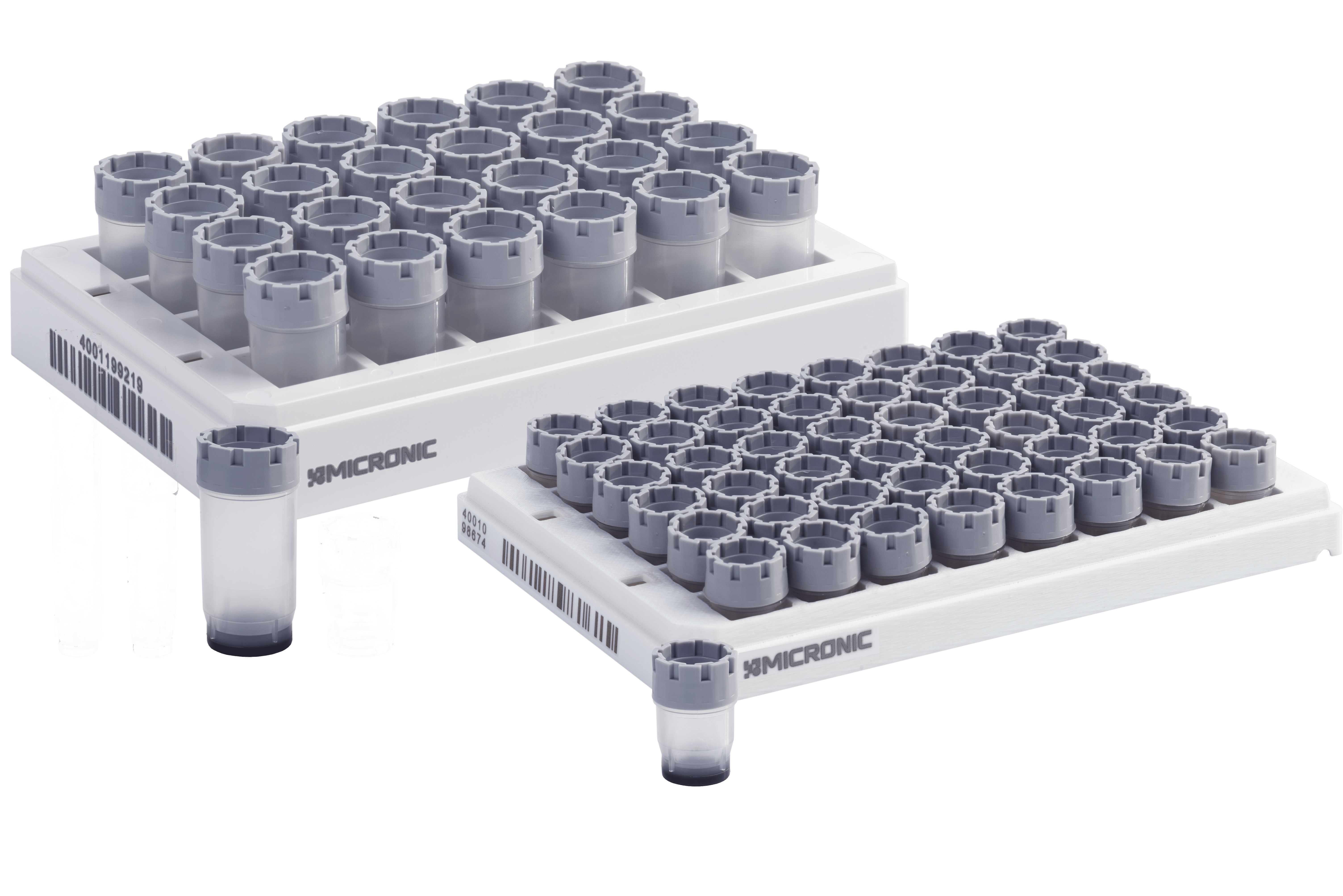 1,00 ml rørene fås som standard med 2D-data-matrix-koder, rackene er 1D-stregkodede, og koderne er permanent lasergraverede.