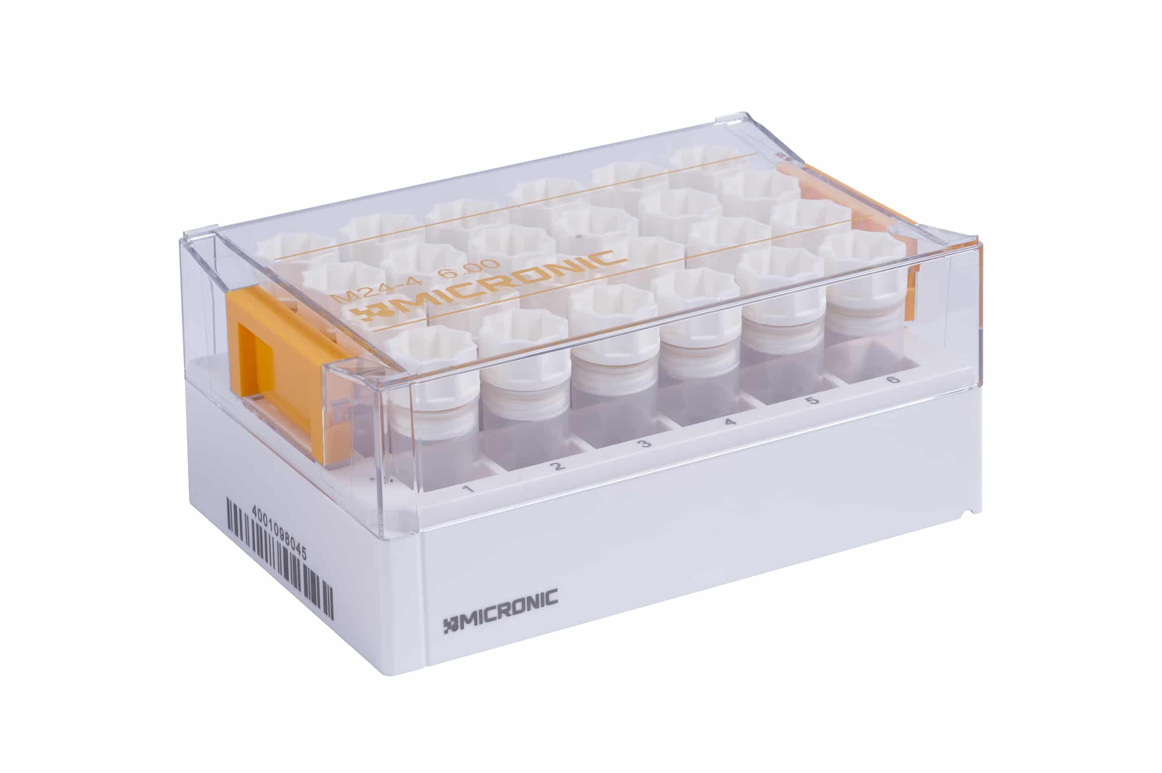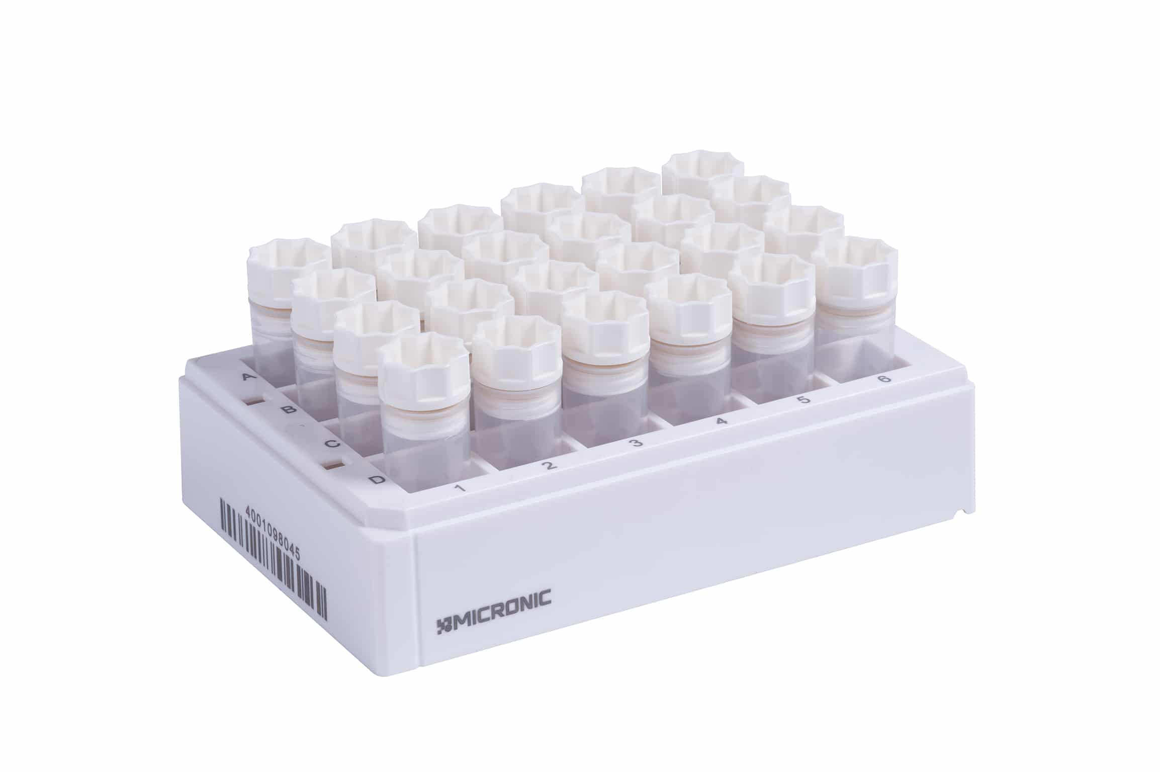 Micronic-opbevaringsrøret på 6,00 ml i 24-brønds format har et stort arbejdsvolumen på 4,80 ml (arbejdsvolumen ved +21 ºC). Disse rør fås ikke-kodet eller med en unik 2D-data-matrix-kode.