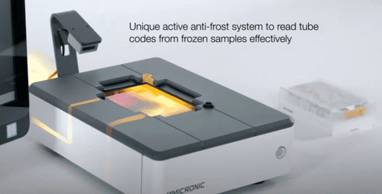The high-end Micronic Rack Reader DR710 reads whole racks filled with 2D Data-Matrix coded tubes. A deep focus image sensor ensures the highest accuracy 2D code reading even if the tubes aren’t flush with the scanner plate or codes are partially compromised. By activating the uniquely designed active anti-frost system on the DR710, ambient air is drawn into the scanner where it is cleaned of dust.