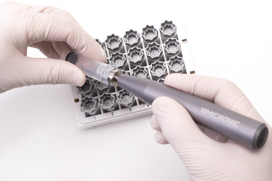 The CS100 is a lightweight tool made from stainless steel, meaning it’s a reliable device for picking tubes from racks to (de)cap them.